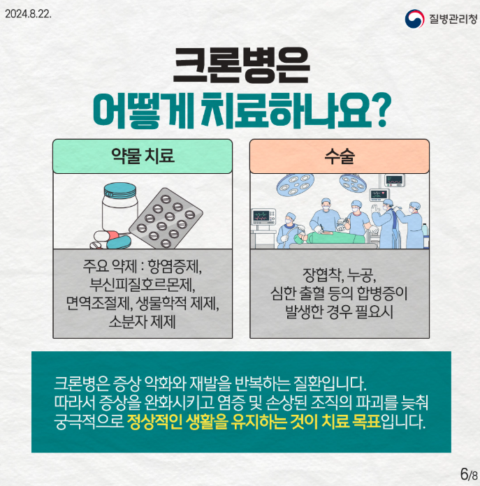 현재까지 크론병은 완치가 어려운 만성 질환으로 분류됩니다. 그러나 생물학적 제제, 면역억제제 등의 약물로 증상을 조절하고 재발을 막을 수 있습니다.