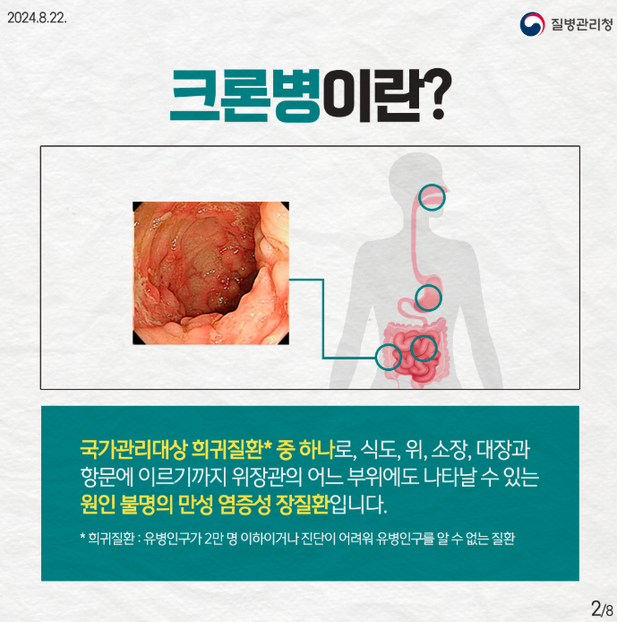크론병은 소화기관 어디에서나 염증이 발생할 수 있는 만성 염증성 장질환입니다. 주로 소장과 대장에 영향을 주며, 설사, 복통, 체중 감소 등 다양한 증상이 나타납니다.